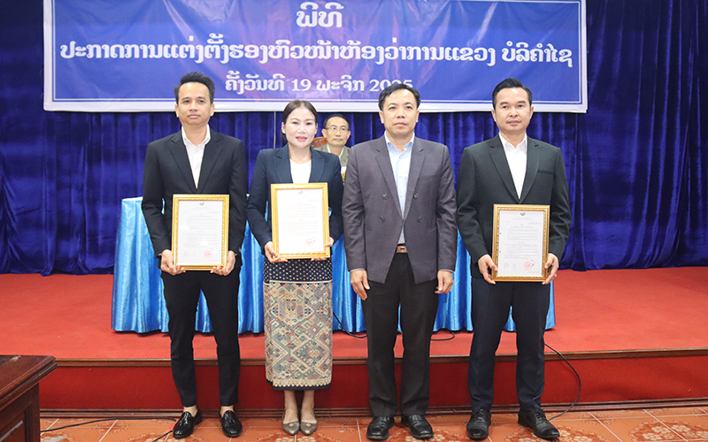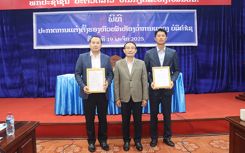 ໂອກາດດັ່ງກ່າວ ທ່ານ ສົມເພັດ ຄຳມະນີ ຮອງຫົວໜ້າຄະນະຈັດຕັ້ງແຂວງ ໄດ້ຂຶ້ນຜ່ານຂໍ້ຕົກລົງຂອງທ່ານເຈົ້າແຂວງສະບັບເລກທີ 773/ຂບຊ, ລົງວັນທີ 14 ພະຈິກ 2025 ແລະ ຂໍ້ຕົກລົງສະບັບເລກທີ 765/ຂບຊ, ລົງວັນທີ 12 ພະຈິກ 2025 ວ່າດ້ວຍການແຕ່ງຕັ້ງທ່ານ ຄໍາປະເສີດ ປັນຍານຸວົງ ແລະ ທ່ານ ພອນສະຫວັນ ວົງສາວົນທອງ ເປັນຮອງຫົວໜ້າຫ້ງວ່າການແຂວງ ແລະ ຂໍ້ຕົກລົງສະບັບເລກທີ 662/ຂບຊ ລົງວັນທີ 8 ຕຸລາ 2025 ວ່າດ້ວຍການແຕ່ງຕັ້ງ ທ່ານ ຂັນທະນູທອງ ຈະເລີນສຸກ ຮັກສາການ ຫົວໜ້າຂະແໜງບໍລິຫານ,ພິທີການ ແລະ ການເງິນ ຂຶ້ນຫົວໜ້າຂະແໜງບໍລິຫານ,ພິທີການ ແລະ ການເງິນ, ທ່ານ ນາງ ວານິດາ ລາດຊະວົງ ແລະ ທ່ານ ແຊງ ໄຊສົງຄາມ ພະນັກງານວິຊາການຂະແໜງບໍລິຫານ,ພິທີການ ແລະ ການເງິນ ຂຶ້ນເປັນຮອງຫົວໜ້າຂະແໜງບໍລິຫານ,ພິທີການ ແລະ ການເງິນ